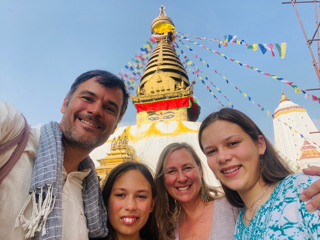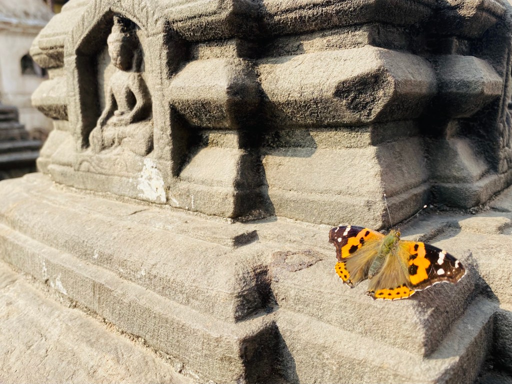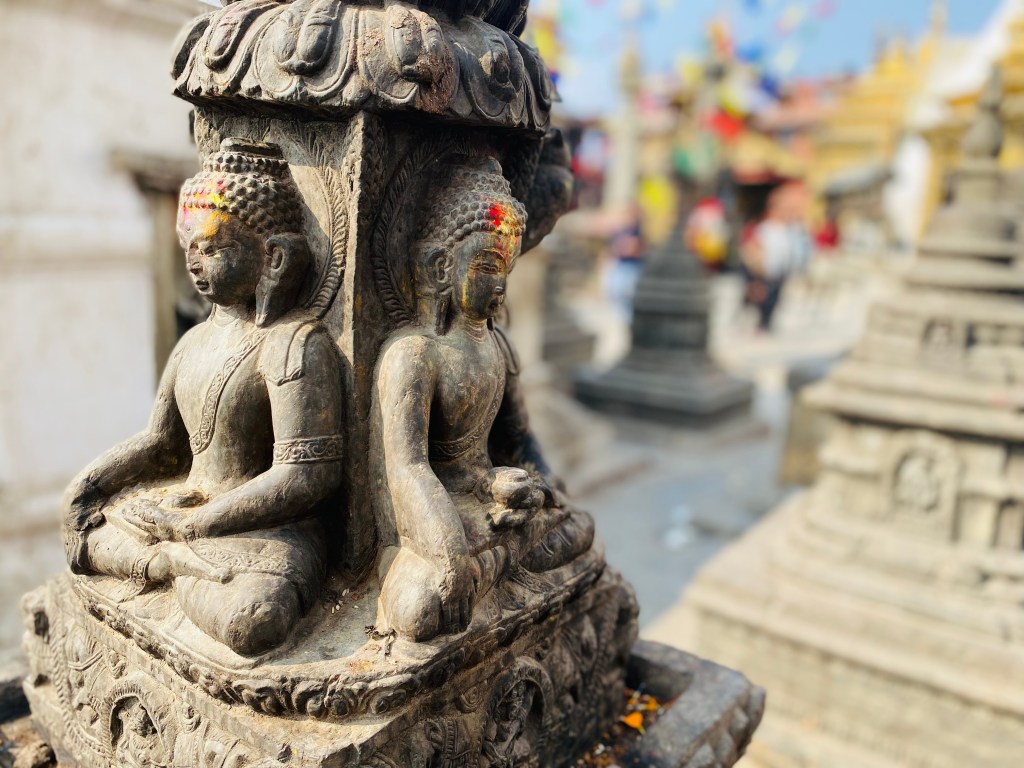 Screech, hoooonk, honk…we are slowly making our way through the bustling streets of Kathmandu in a cramped taxi. The traffic in this city is very extreme. The streets are filled with vendors, motorcycles, people, buses, dogs, trucks and cars all going somewhere. I am looking out the window and excited to arrive at Swayambunath Stupa.