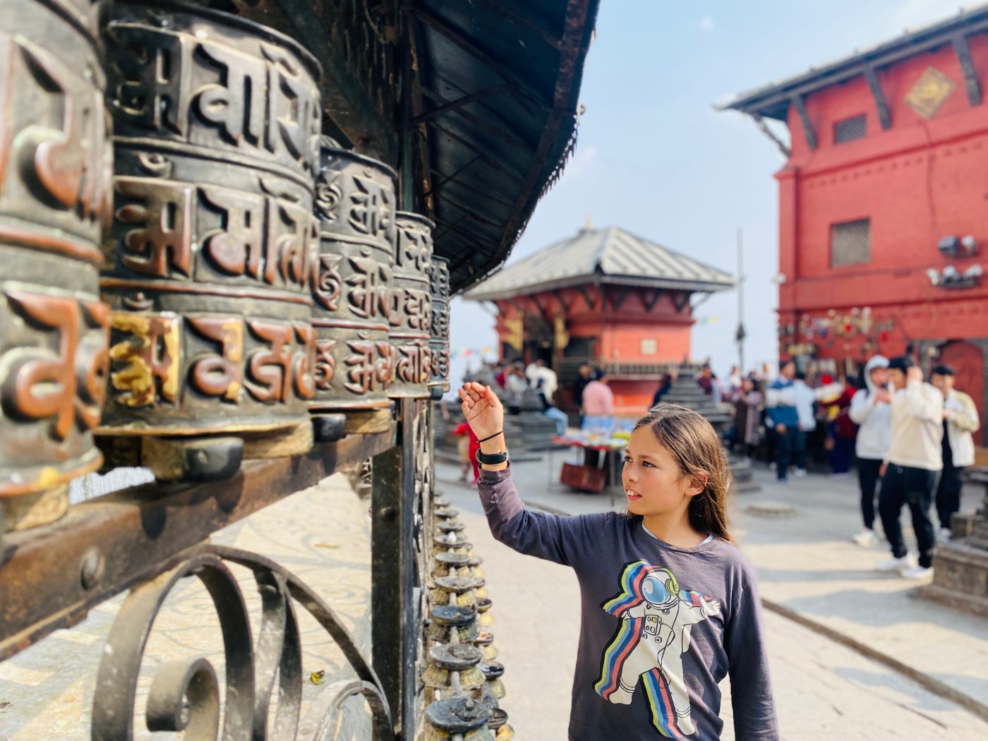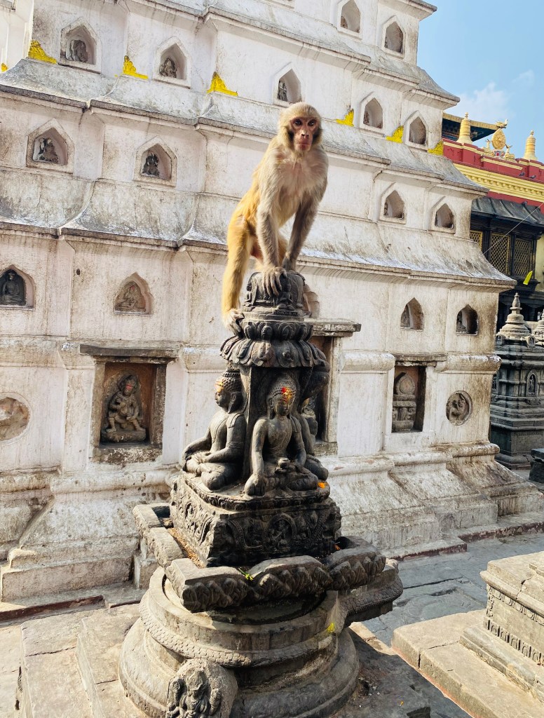 Even surrounded by a big, modern city, I could feel why Manjushree felt that this place was sacred. This stupa is worshipped by both Hindus and Buddhist, so there are statues and relics from both religions. I also got to see a monkey drinking sprite and sadly I saw some people hand-feeding them.