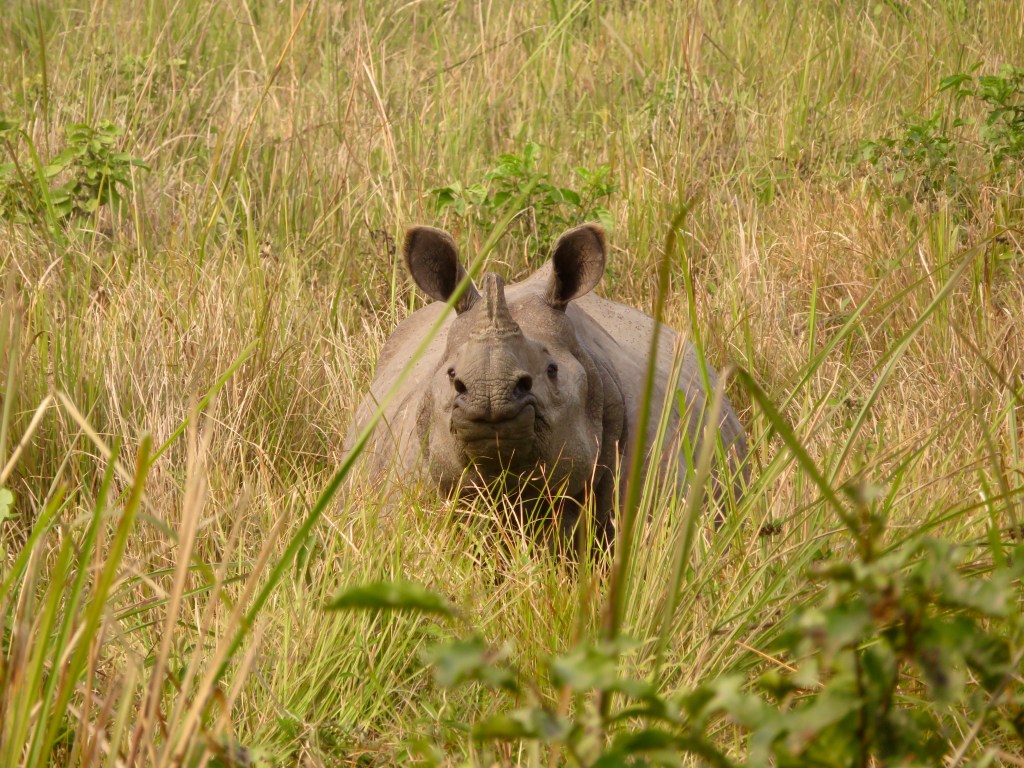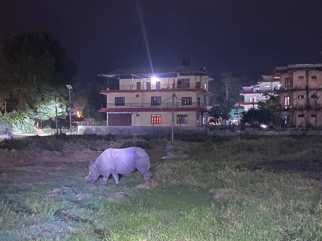 Although the One-horned rhino is only listed as vulnerable and their numbers have gone up from 200 to 4,000 in Nepal and northeast India over the last century, there is still cause for concern. Poaching for their horn continues to be an issue, as does habitat loss, which pushes rhinos further into towns and cities more frequently. Surprisingly, our first encounter with a rhino in Chitwan was in a field near the hotel where we were staying. Seeing this made it clear to us how this can cause conflict between humans and rhinos. Fortunately the Nepali community seems to live well with these wild animals. I hope that others can see the value in this as well.
